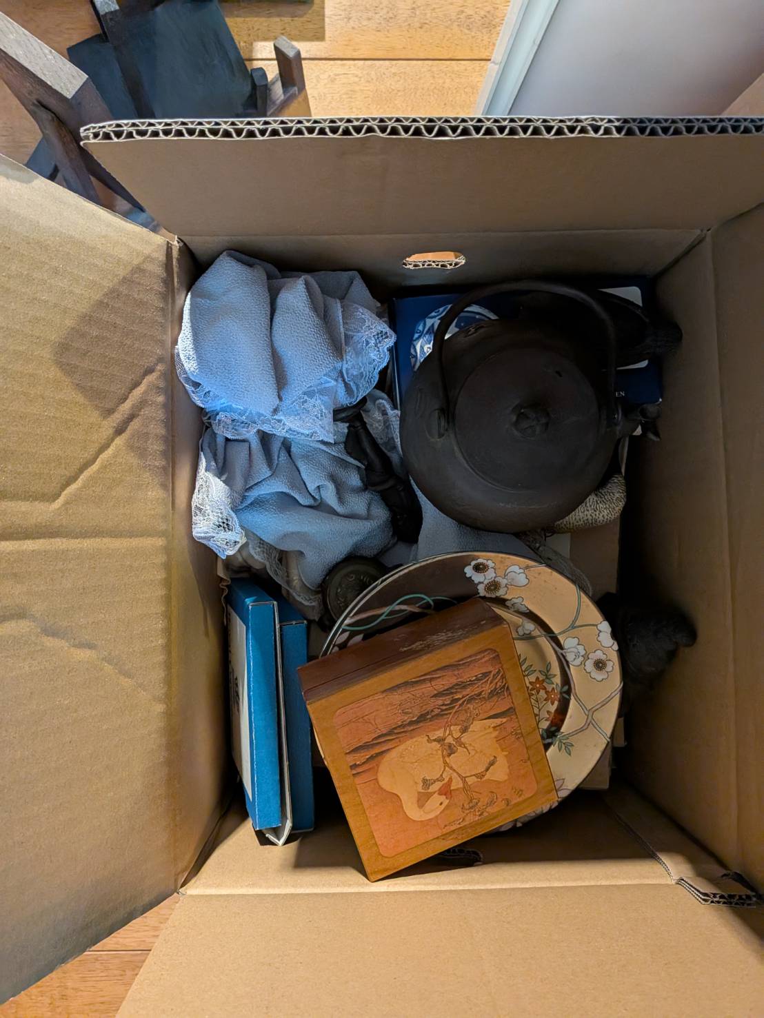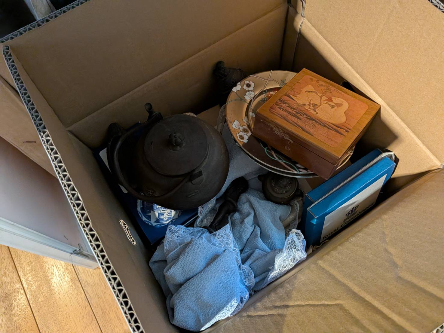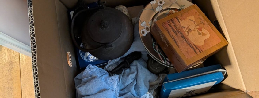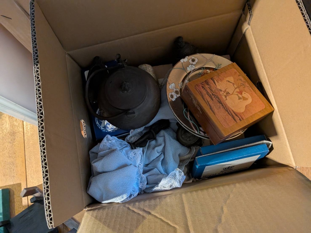 拝見したところ、南部鉄器の鉄瓶や、花柄の陶磁器皿、意匠が施された木箱、西洋陶磁器ブランドの化粧箱入り品など、多彩な骨董・古道具が見つかりました。