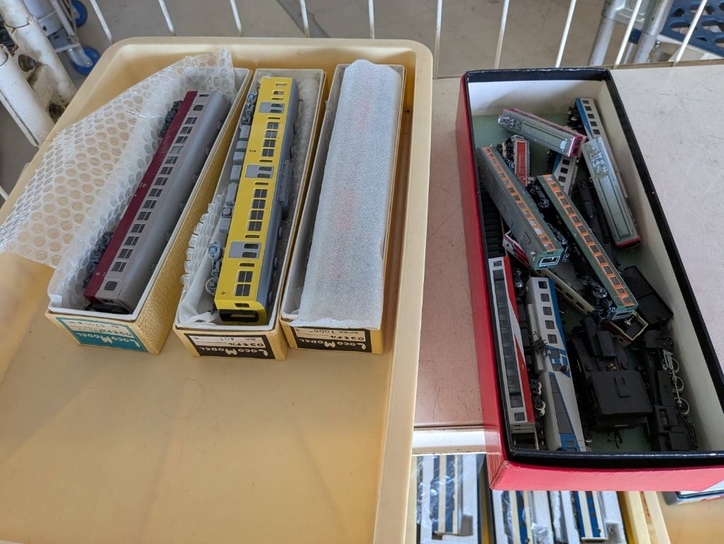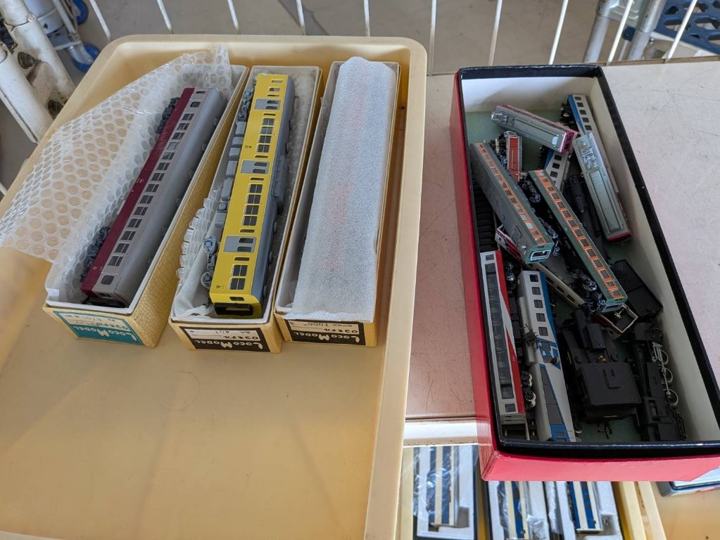 拝見したお品は、箱付きの国鉄型電車や特急型車両、鮮やかな塗装が施された通勤型模型など、多彩なラインナップ。