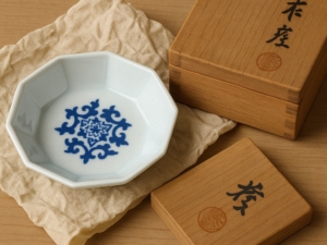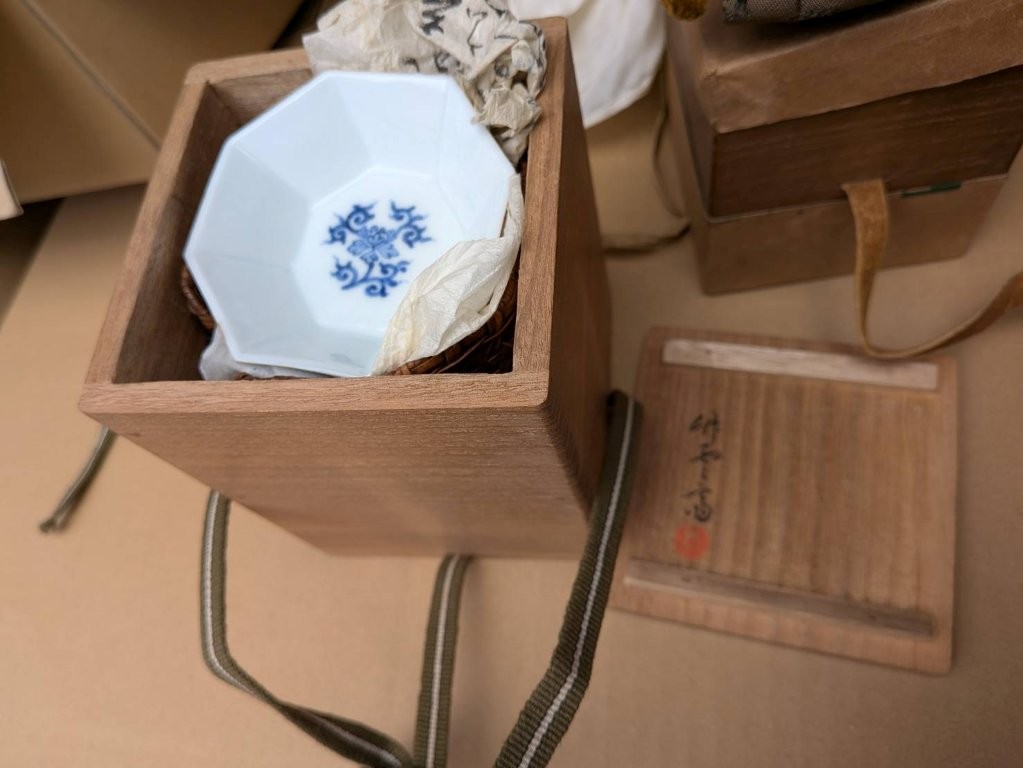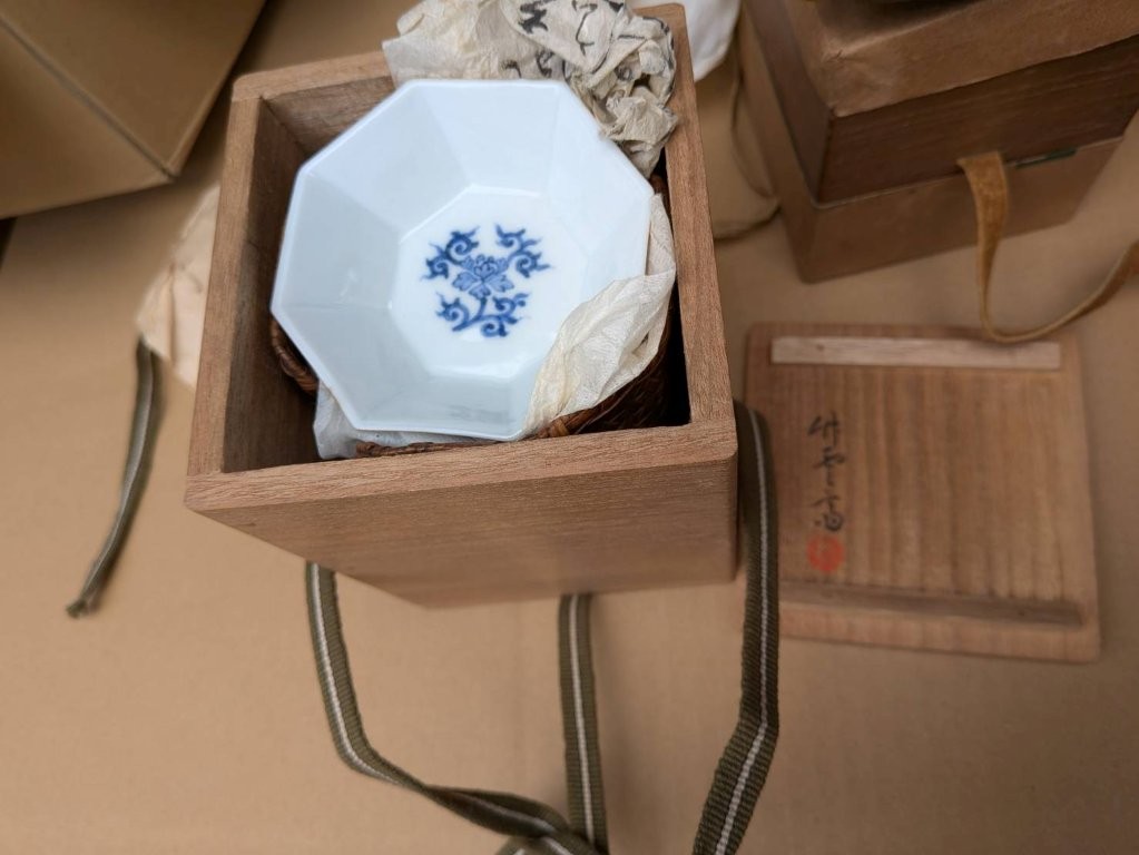 布に包まれたまま大切に守られており、八角形の造形や藍色の染付が鮮やかに残っていました。