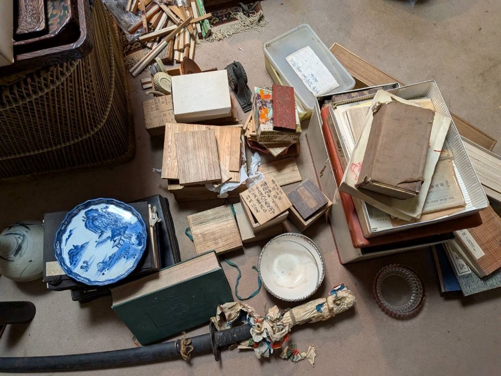 空き家となった実家の片付け中に見つかった明治時代の骨董品。木箱入りの書道具、和本、染付の皿、陶器、刀剣などが床に広げられている様子。