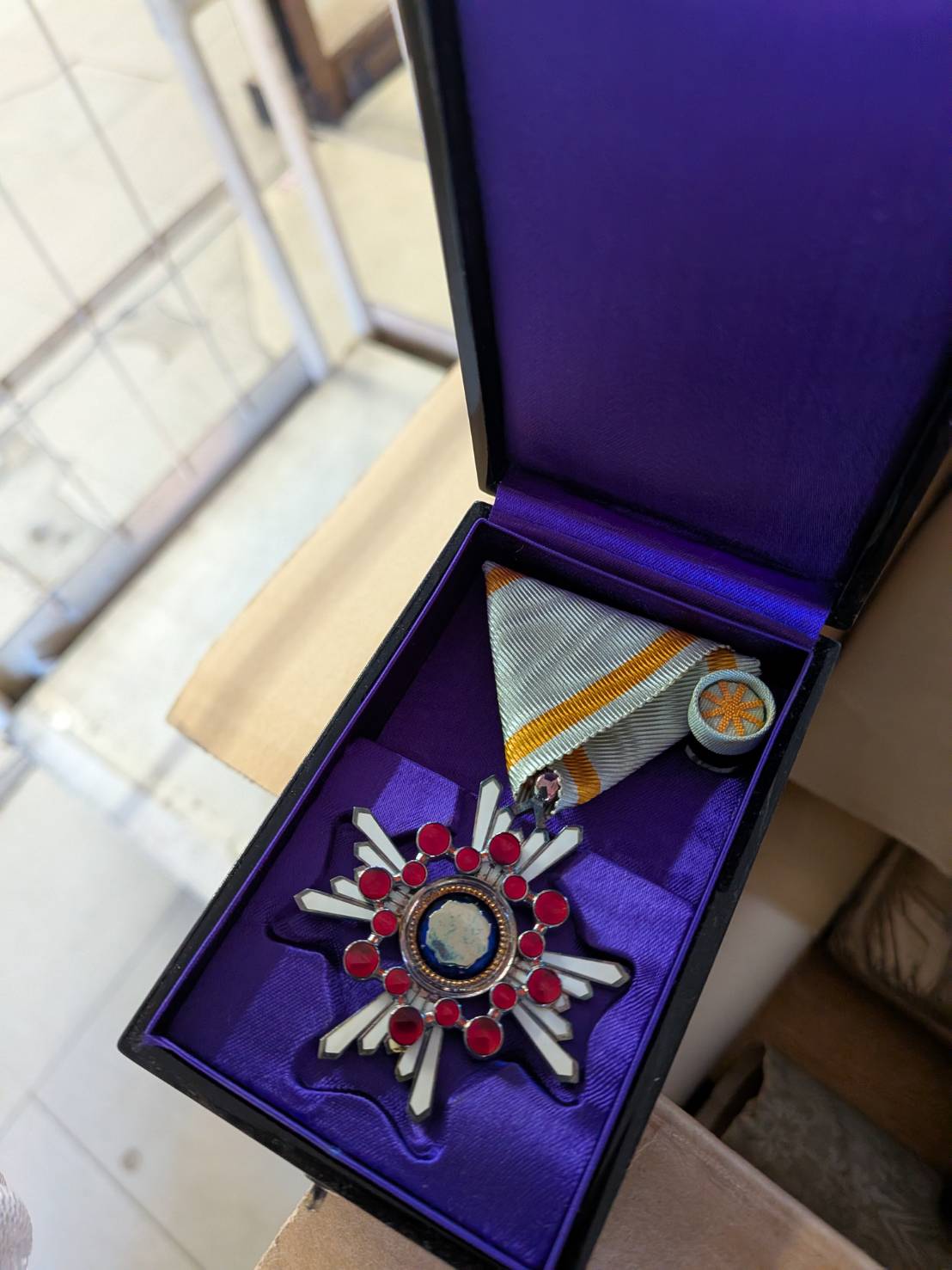 そうお話しくださり、慎重に包まれた箱を開けると、紫の布張りの箱の中に、勲五等 双光旭日章が静かに納められていました。