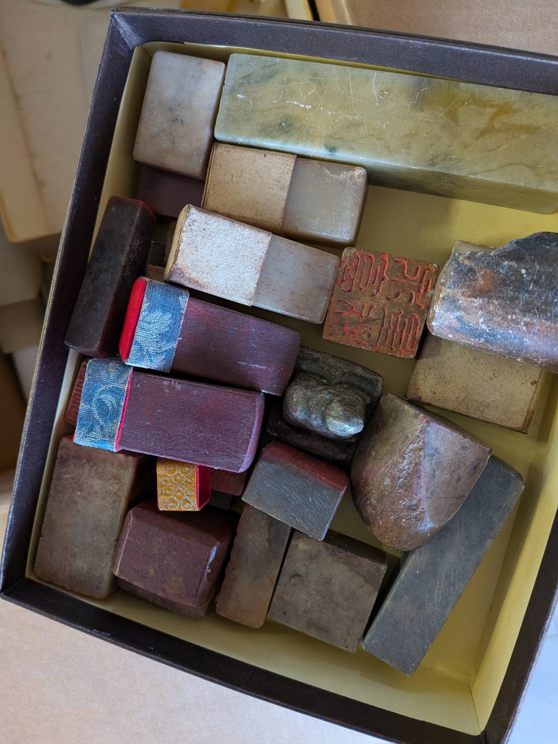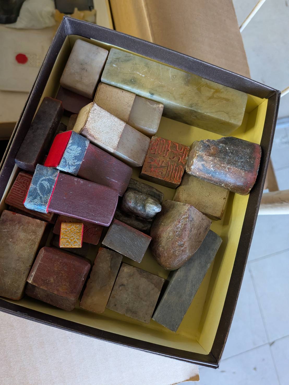 そうお話しくださり、差し出された箱の中には、大小さまざまな中国印材が静かに収められていました。