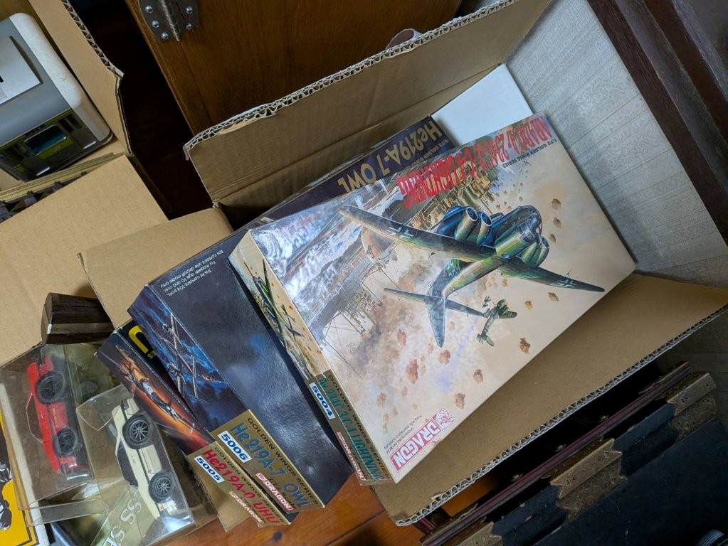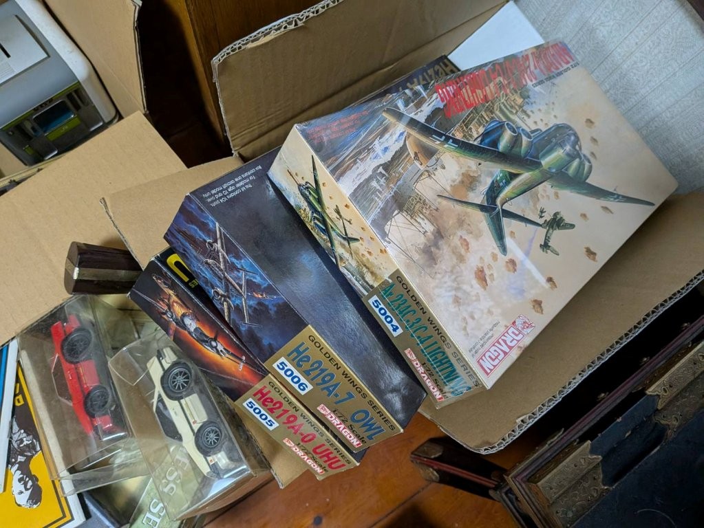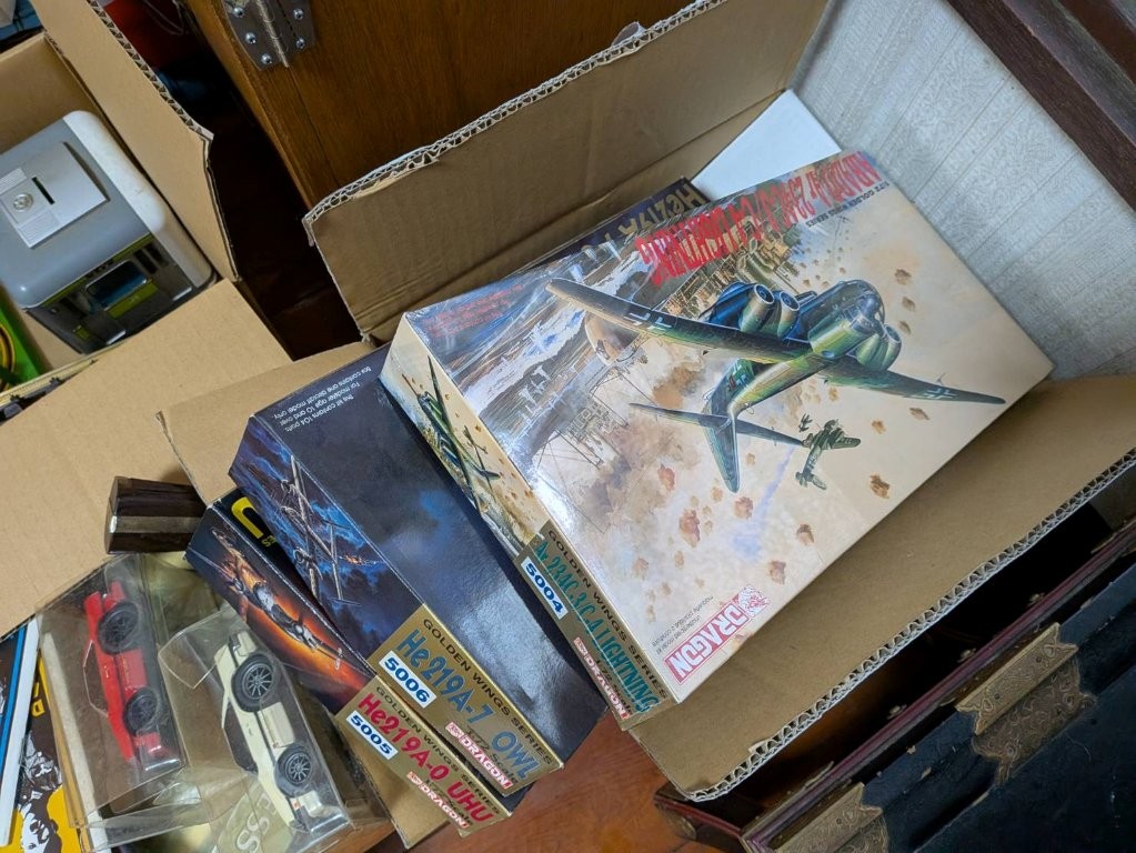 段ボール箱の中には、飛行機を題材にした古い時代のプラモデルが複数点収められていました。