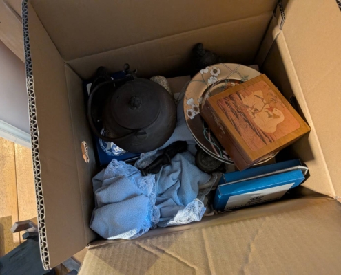 拝見したところ、南部鉄器の鉄瓶や、花柄の陶磁器皿、意匠が施された木箱、西洋陶磁器ブランドの化粧箱入り品など、多彩な骨董・古道具が見つかりました。